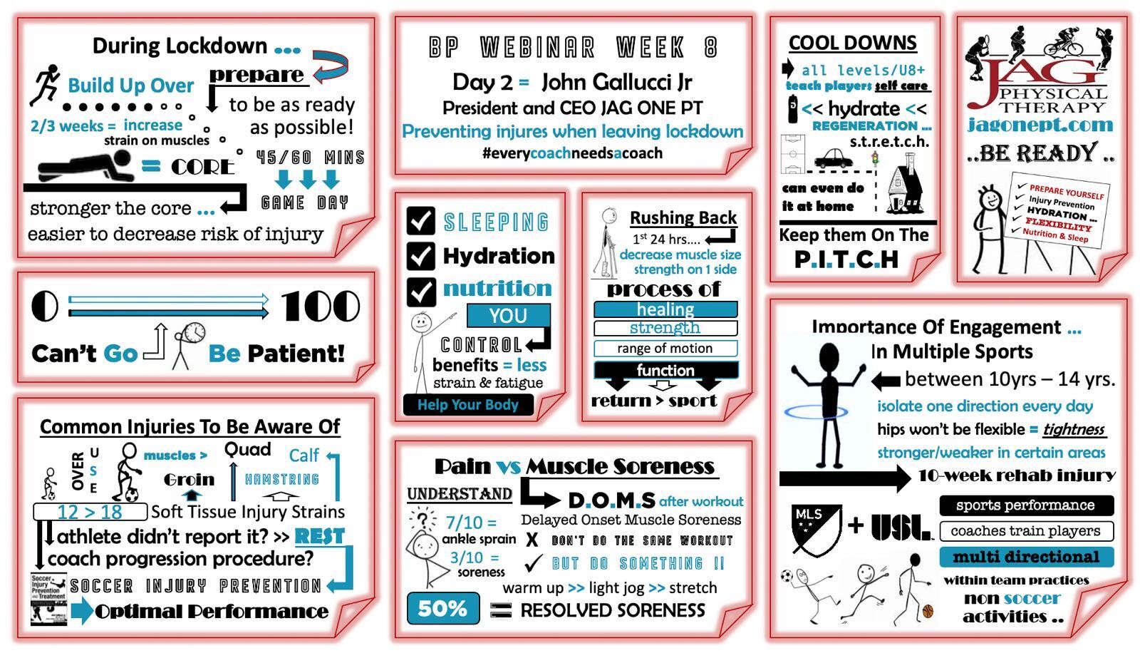 John Galluci Jr President and CEO of Jag One Physical Therapy and MLS Medical Coordinator joined Tom Shields and Mark Wilson for an important conversation directed to: players, coaches and parents as they prepare to return to youth soccer post “Lockdown”. With over 25 years experience working with some of the country’s largest sporting organizations, John’s insights were tremendous and people should pay very close attention to his recommendations regarding what can be being done at home right now in order to minimize the likelihood of having another extended period of time without play.